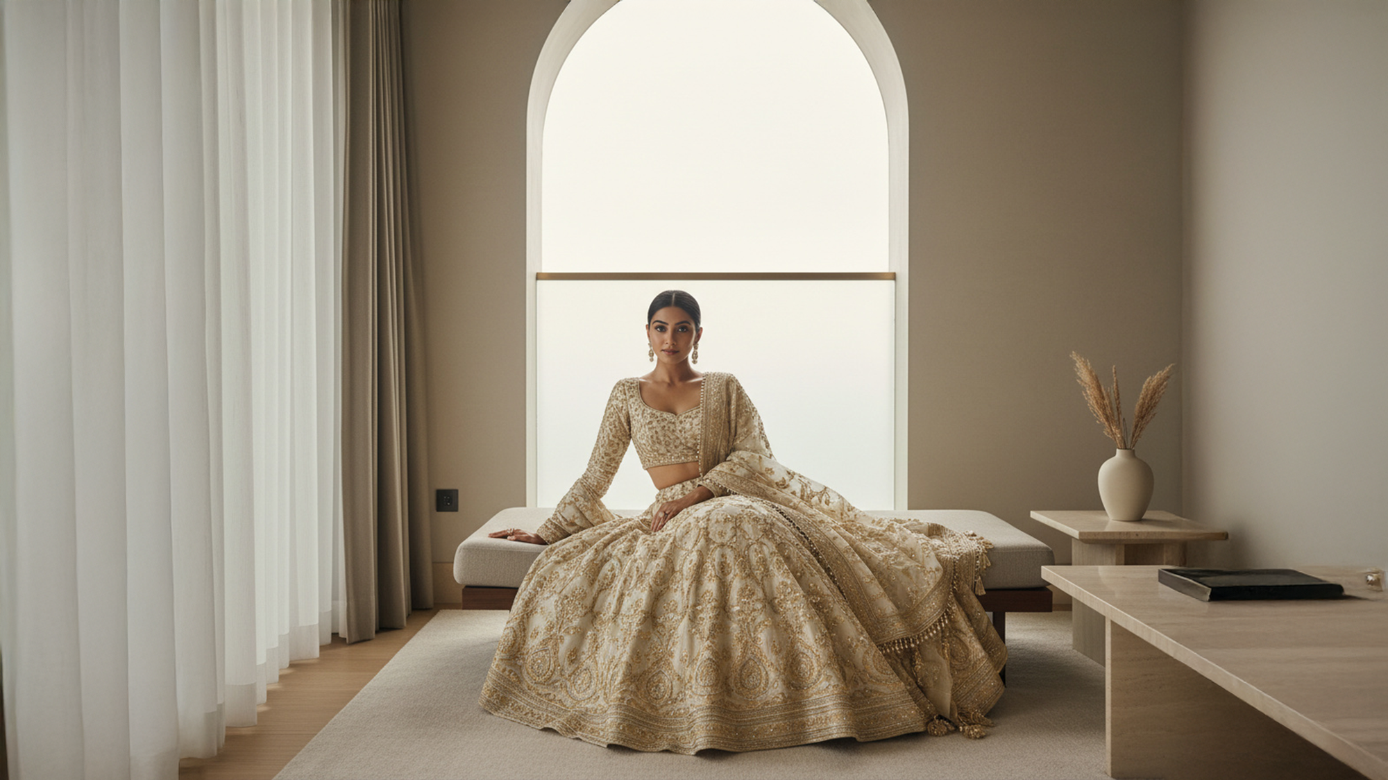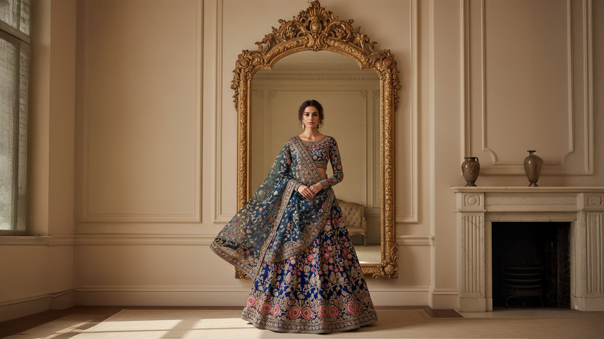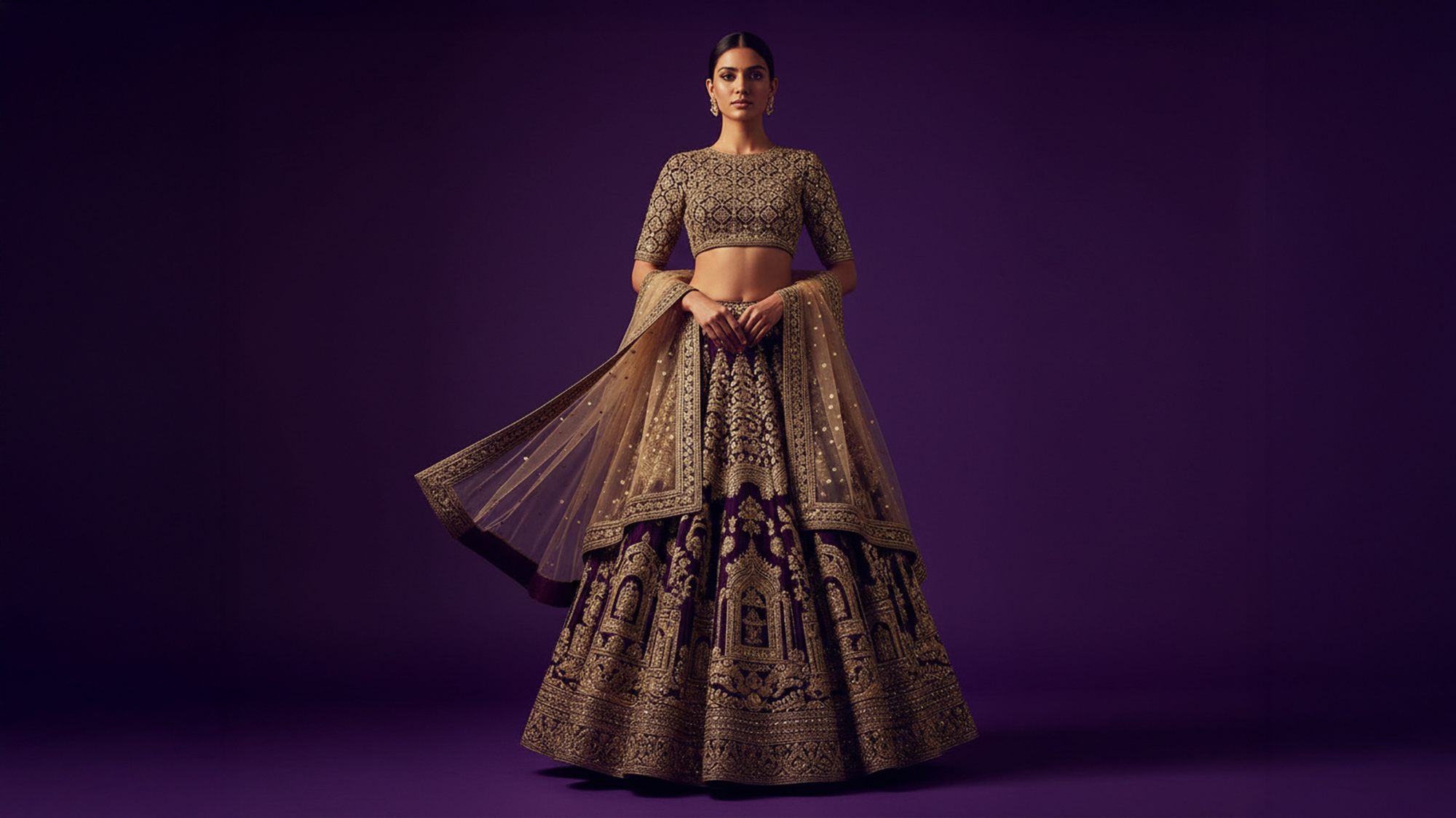 Ein Lehenga ist ein traditionelles indisches Kleidungsstück, das aus einem langen, bestickten Rock, einer passenden Bluse (Choli) und einem Schal (Dupatta) besteht. Es wird vor allem zu festlichen Anlässen wie Hochzeiten getragen und vereint Eleganz mit aufwendiger Handarbeit und luxuriösen Stoffen.