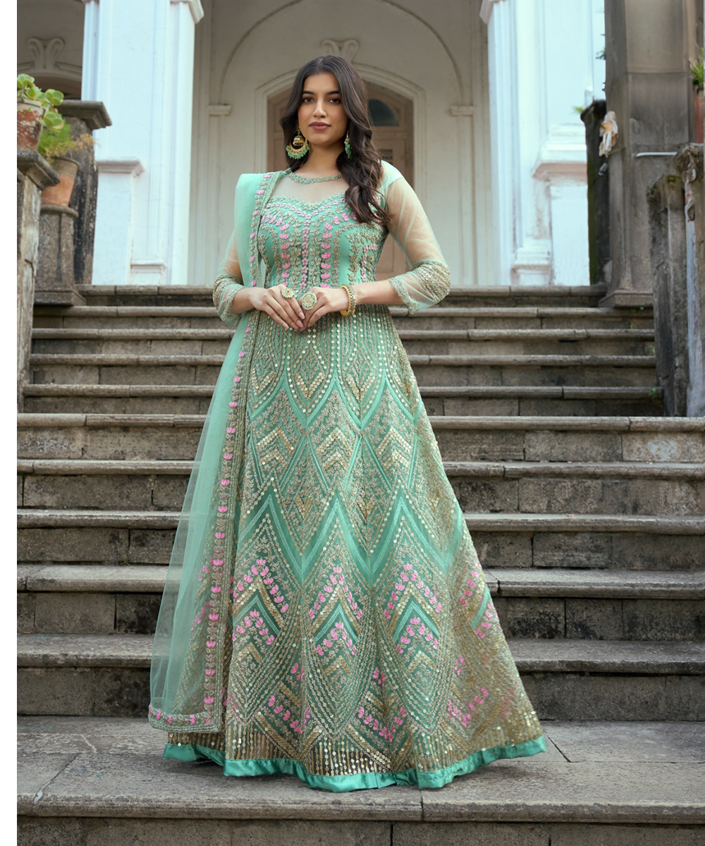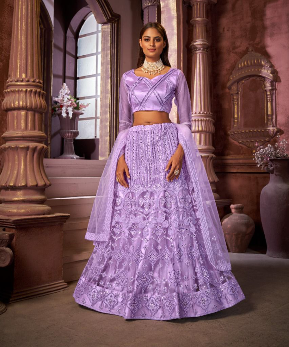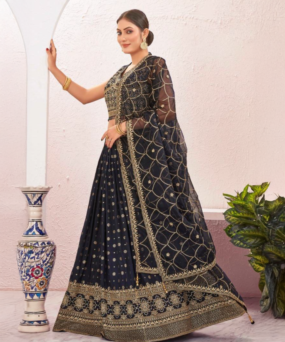 Ein Lehenga ist ein traditionelles indisches Kleidungsstück, das aus einem langen, bestickten Rock, einer passenden Bluse (Choli) und einem Schal (Dupatta) besteht. Es wird vor allem zu festlichen Anlässen wie Hochzeiten getragen und vereint Eleganz mit aufwendiger Handarbeit und luxuriösen Stoffen.