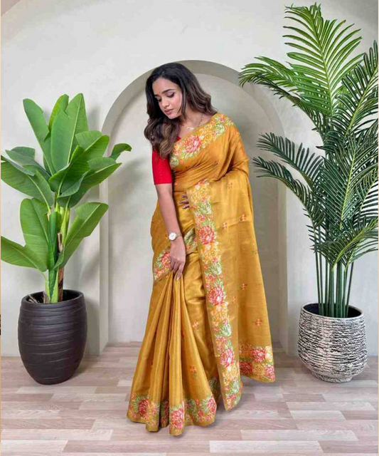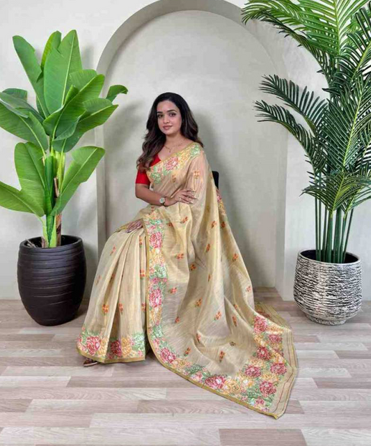 Zartgelber Baumwoll-Saree mit floraler Bluse