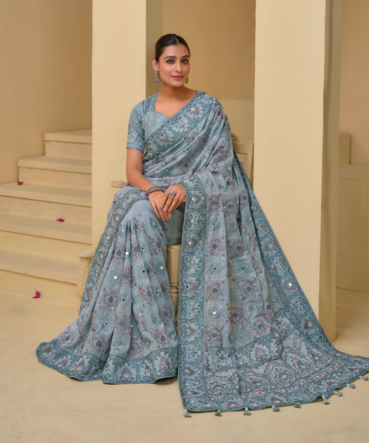 Blau Weißes Saree mit Einzigartigem Muster aus Chinon